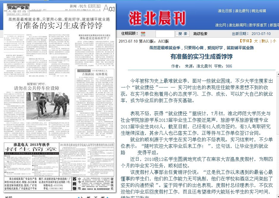 公司旅游学系旅游管理专业员工实习与就业工作特色鲜明,成绩突出,受到《淮北晨刊》专题报道,链接如下:http://www.hbnews.net/epaper/hbck/html/2013/07/10/A03/A03_38.htm